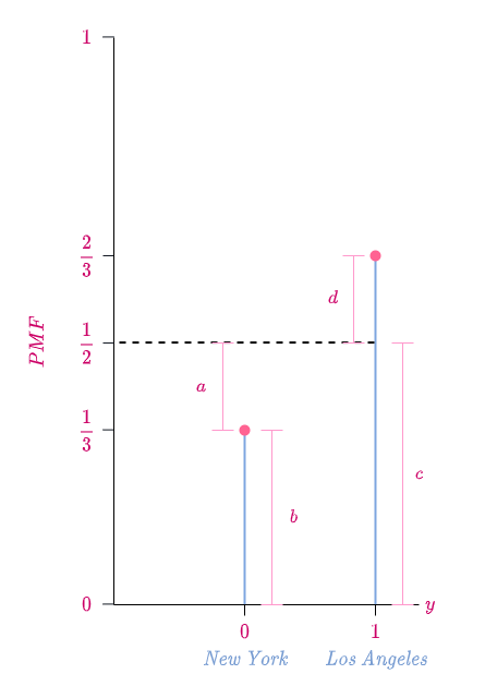 \end{equation*} The following diagram is a pictorial representation of the PMFs of X and Y. I have written the place that a particular random value corresponds to for the sake of clarity.