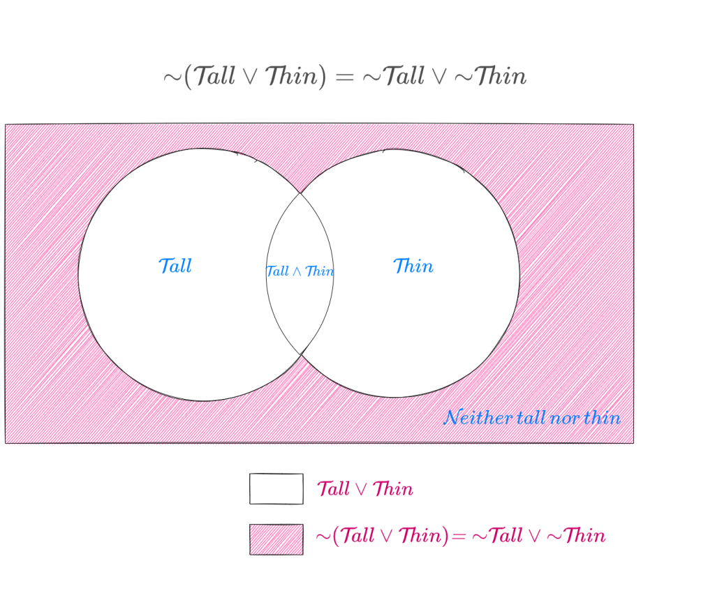 Now suppose a competing modeling agency runs an ad stating “Please don’t apply if you are either tall or thin.” So who are the people eligible to apply? Looking at the list of people enumerated as groups, we can see that only group 4 is eligible to apply. The inclusion of group 4 is equivalent to the exclusion of the other groups, namely, groups 1, 2 \text{ and } 3. Let us now express these logically.