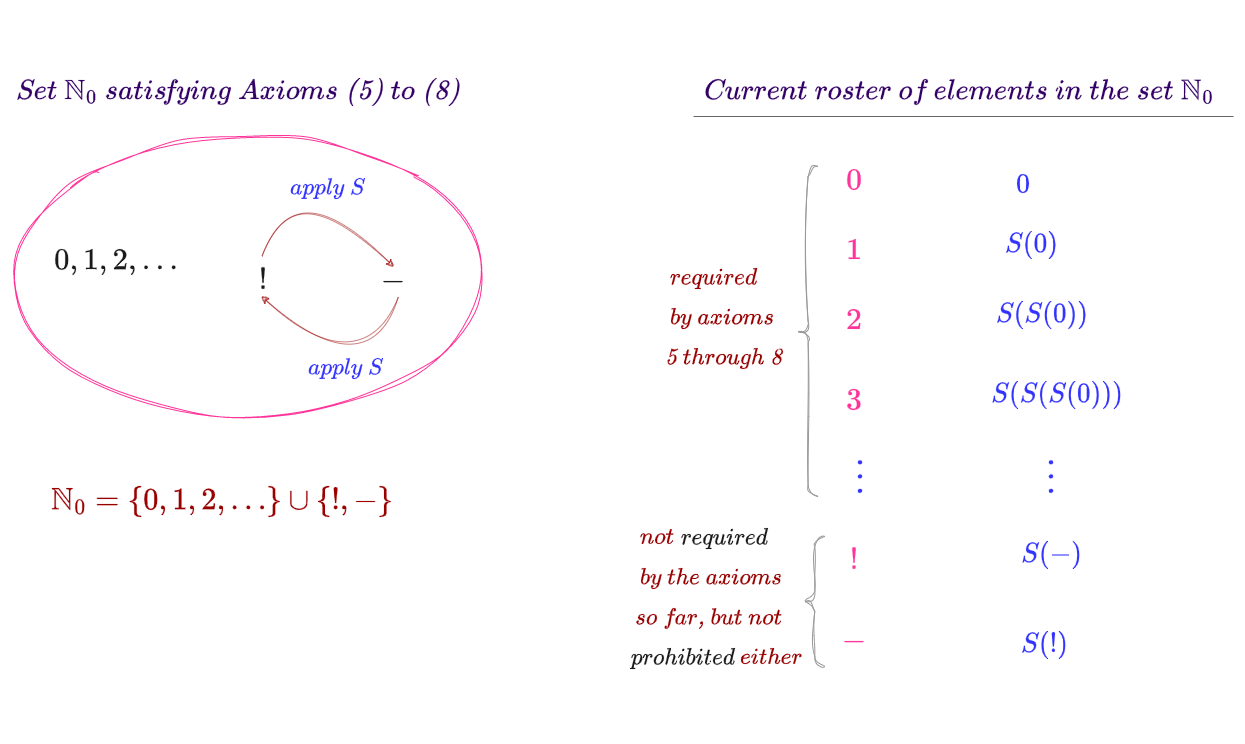 Similarly, there could be other versions of \mathbb{N}_0 with different successor functions, each of which satisfies all of the above axioms from 5 \text{ through } 8 but could also have elements other than natural numbers. This is illustrated below.