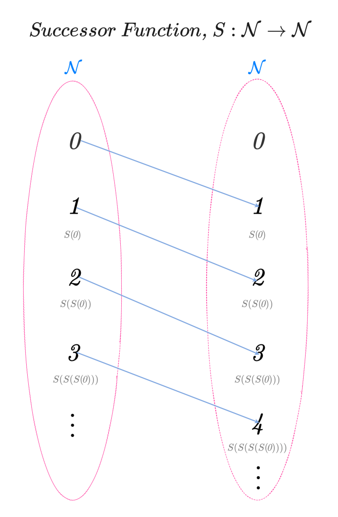 \end{equation*} We can see from the diagram that an input of 0 maps to an output of 1, an input of 1 maps to 2 and so on. Therefore, we can model the “next” operation as a function S : \mathcal{N} \rightarrow \mathcal{N} that takes a natural number as input and produces a natural number as output. Here, the letter S stands for ‘successor’ and we have S(0) = 1, S(1) = 2 and so forth. We will refer to this function S as the successor function since it establishes a succession within the set of natural numbers, \mathcal{N}. This function S is illustrated below.