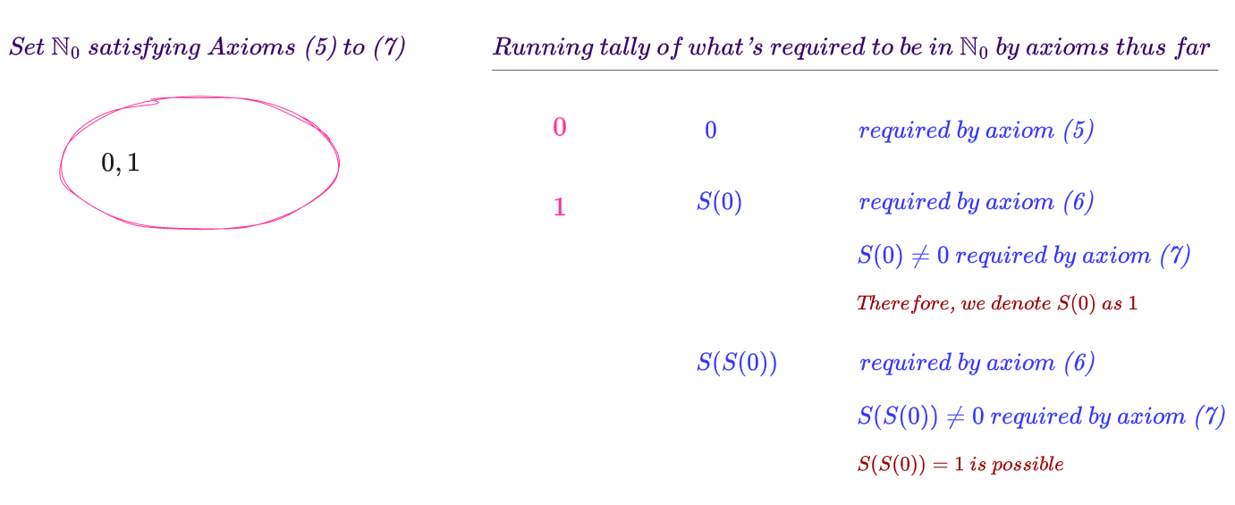 This axiom leads to some important consequences. It excludes the possibility of defining \mathbb{N}_0 to be just \{0, 1\}. We already have S(0) = 1 and since S is an injective function, we cannot have S(1) = 1. Axiom 7 excludes the possibility that S(1) = 0. Thus S(1) must be some other natural number, which we denote as 2. Therefore, we can define 2 = S(1).
